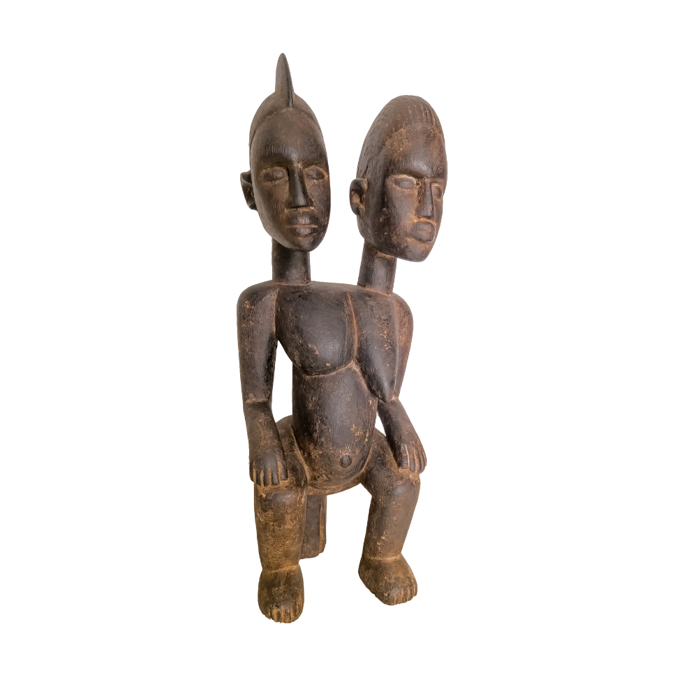 Statuette colon baoulé en bois peint représentant un personnage assis sur un tabouret, le visage aux traits typiques, les mains sur les genoux. La statuette colon est une sculpture qui a été introduite au sein de l’art africain pendant la période coloniale. Ces sculptures représentent des fonctionnaires coloniaux européens. Ils se caractérisent par des motifs décoratifs récurrents, tels que des casques de moelle, des costumes ou des uniformes, et ils sont peints dans des couleurs vives et brillantes.
